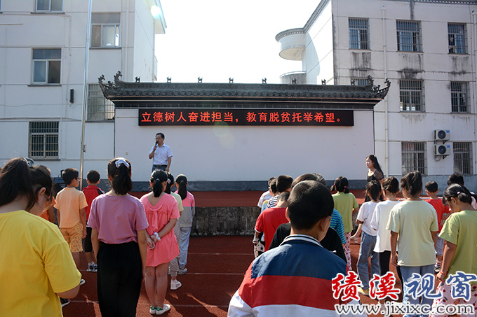 9月7日,绩溪县金沙学校大操场上国歌激昂,国旗猎猎,“立德树人奋进担当,教育脱贫托举希望“巨幅LED标语格外醒目。校长许道红在国旗下讲话中,代表学校向全体师生认真宣讲国家教育扶贫教育脱贫相关政策,列举了大量具体的政策举措和翔实的扶贫数据告知大家,党的“十八大”以来,以习近平同志为核心的党中央关心关怀关注贫困地区贫困人口在教育方面的扶贫脱贫问题,希望同学们学会感恩,牢记习总书记的殷殷嘱托,发奋学习不断进步,在老师指导下学有所成,使自己成为对国家对人民有用的人,将来用智慧和汗水为祖国发展和家乡建设做出自己的一份贡献。