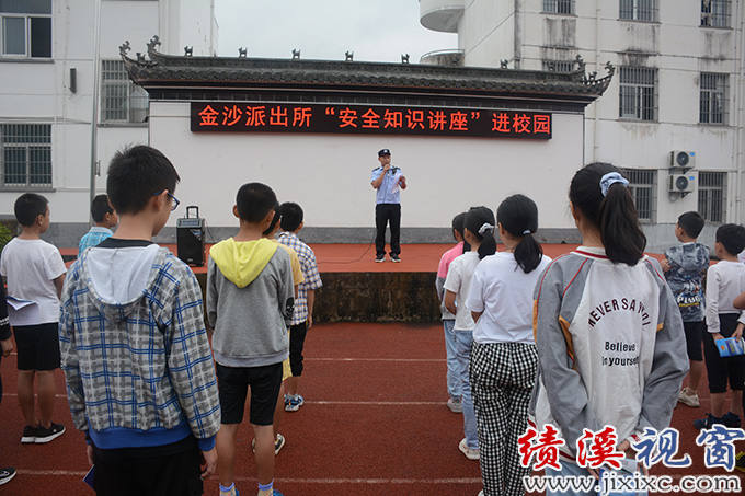 金沙派出所李存华警官则给同学们上了一堂实实在在的法治安全教育课。他从交通安全、消防安全、网络安全三个方面,结合典型案例,结合中小学生一些常见的违规违法行为习惯,用朗朗上口的顺口溜劝告大家一定要重视出行安全,如“红灯停绿灯行,放学回家靠右行”;“一看二慢三通过,交叉路口要慢行”;“骑车双手扶稳把,戴着耳机可不行”等等。他还就乘车安全讲解了相关安全知识,如不乘坐非正规交通工具,车停稳后再上下。坐车头手不能伸窗外,尊老爱幼讲礼貌等等。讲到消防安全,李警官要求同学们一定要注意科学防范火灾,掌握简易灭火方法,要知道如何正确拨打火警电话“119”以及火场逃生的正确做法。