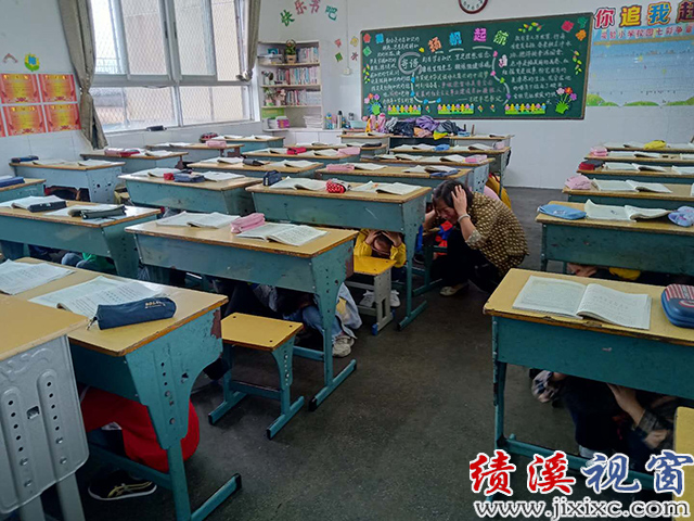 9月18日上午9点18分,急促的防空警报声骤然响彻绩溪县实验小学校园上空,仅仅几秒钟之后,全校师生的身影迅速俯身弯腰,双手抱头,在各班教室躲藏进课桌下。这是实验小学正在进行“9·18”防空防灾疏散演练活动,因这时恰逢天下大雨,学校当即改变原老师组织学生快速由教室从就近的逃生通道中安全撤离到校园内广场中的计划。