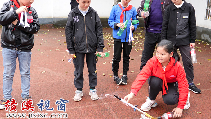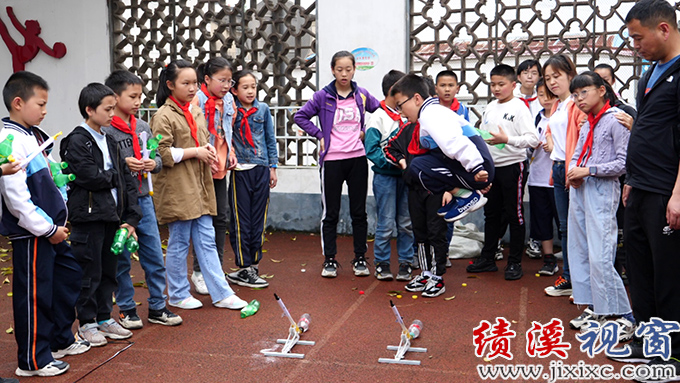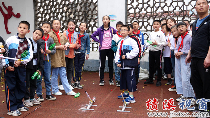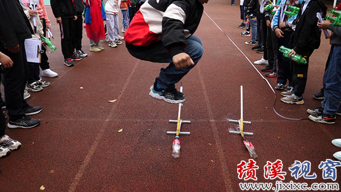 参加比赛的同学们,分班在科技室精心制作了气火箭。在比赛现场,同学们要装上自制的火箭弹,而且自行发射特别兴奋。同学们将火箭弹装在发射台的发射筒管上,发射筒管上的尾部链接了一截塑料管。在塑料管上,同学们装上空的矿泉水瓶,然后全身跃起,双脚踩在矿泉水瓶上,火箭在气体的冲击下,“啪”的一声,飞向远方,50米、60米、70米……同学们欢呼雀跃!