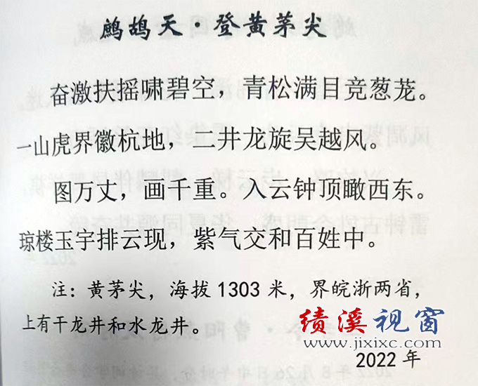 我翻到《鹧鸪天·登黄茅尖》这阕词,目光刚落进“奋激扶摇啸碧空,青松满目竞葱茏”,便觉一股清气扑面而来。 黄茅尖海拔1303米,是皖浙界山,站在峰顶,山风穿林、松涛贯耳,这“啸”字既是山风的呼啸,更是老师登高时心潮的奔涌。这是他少年时代在农村生活中淬炼出踏实肯干的底色,而后从教进入绩溪中学投身共青团工作,那段岁月里,他以青春伴青春,用热忱点燃无数少年的理想之火;后来他走上赢洲镇党委书记要职,又在政协岗位上退休,几十载岁月里,他始终如峰顶青松,扎根乡土、向上生长,从未改那份坚韧向阳的精神力量。 “一山虎界徽杭地,二井龙旋吴越风。”此句最见格局。黄茅尖形如猛虎雄踞徽杭古道,一边是徽州的黛瓦白墙,一边是杭州的烟柳画桥;干龙井与水龙井两股清泉在山顶回旋,恰如吴越文化在此交融激荡。老师生于绩溪家朋,长在徽文化的浸润里,他的诗中,文旅题材占比尤重,笔下尽是家乡乡镇的灵秀与风情。他以脚步丈量故土的每一寸土地,又以笔墨将乡镇的特色与神韵定格成永恒的诗行。 更动人的是,他的诗词里从不忘红船初心,更藏着对家乡革命先辈的敬仰与追思。那些绩溪本土的烈士人物,那些烽火岁月里的热血故事,都被他凝练成铿锵诗句。字里行间,既有对革命先辈舍生取义的赞颂,更有对红色精神代代相传的期许,让诗篇有了穿越时空的力量。 “图万丈,画千重。入云钟顶瞰西东。”站在入云的钟形峰顶远眺,千山万壑如天然画卷,皖浙大地尽收眼底。这“瞰”字里有从容,有豁达,更有历经风雨后的通透。老师从学徒到从教,从担任乡镇要职到履职政协,人生的每一步都走得扎实稳健。如今回望过往,那些乡土民情的点滴、政事民生的感悟、文旅行走的见闻、红色记忆的追溯,都成了笔下的千重画卷。他的诗没有华丽辞藻的堆砌,却在平实字句里藏着滚烫的温度,一如这峰顶的风,看似清冽,却带着草木的芬芳。 “琼楼玉宇排云现,紫气交和百姓中。”结尾尤为动人。云雾散开处,远处屋舍如琼楼玉宇浮现,祥瑞紫气在人间流转。这不仅是眼前之景,更是老师心中的愿景——山河锦绣,百姓安康。他的诗词里始终装着烟火人间,无论是写故乡的田埂阡陌、山核桃林的葱郁,还是写从政路上的民生百态、红船初心的坚守,都带着对土地和人民的深情。这种情怀,让他的文字有了穿越时空的力量,也让我们读懂:真正的好诗,从来不是孤高的吟唱,而是与山河共情、与百姓同心的回响。